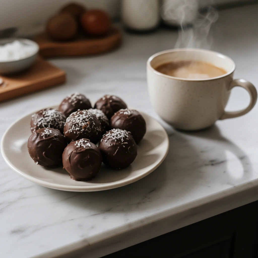 Elles sont enrobées de chocolat noir et garnies à l’intérieur de notre préparation crémeuse et protéinée à la noix de coco. Un coup de foudre assuré!🤤